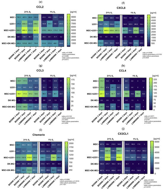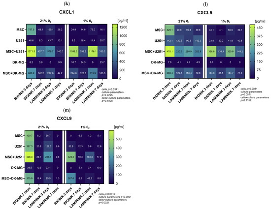 Heatmap plots showing the mean levels of selected chemokines in the medium from 3D-bioprinted cultures of glioblastoma multiforme cell lines. Quantitative evaluation of (a) CXCL12, (b) CXCL16, (c) CCL5, (d) CCL7, (e) CCL2, (f) CXCL8, (g) CCL3, (h) CCL4, (i) chemerin, (j) CX3CL1, (k) CXCL1, (l) CXCL5, and (m) CXCL9 secretion by Luminex method in 3D-bioprinted cultures of U251 and DK-MG glioblastoma multiforme cell lines with/without mesenchymal stromal cells (MSC), maintained in 21% O2 and 1% O2 on two types of bioink, CELLLINK Bioink or CELLLINK Laminink521, collected after 3 and 7 days of culture. Values were normalized by the chemokine levels in the culture medium maintained for 3 or 7 days with empty bioink. The levels of chemokines were determined in [pg/mL]. The graph shows numerical averages from at least three experimental replicates for each condition. Statistical significance was determined using a mixed-effects model analysis with Geisser–Greenhouse’s correction in GraphPad Prism software (version 10.3.0). The detailed results of the multiple comparisons of the mixed-effects model analysis can be found in Supplementary Table S1.