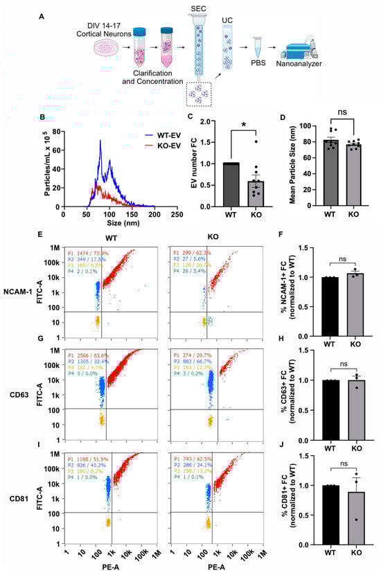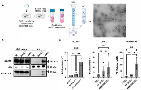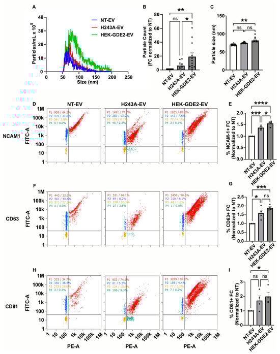 For nano-flow cytometry data acquisition, a NanoFCM Nanoanalyzer (Nottingham, England) in the Johns Hopkins EXCEL—EXtracellular particle Characterization and Enrichment Lab—was utilized. The nano-analyzer was used to measure the side scatter and fluorescence of EVs following the manufacturer’s instructions. The instrument was calibrated for concentration and size using 200 nm PE- and AF488 fluorophore-conjugated PS beads and a Silica Nanosphere Cocktail (NanoFCM, Nottingham, England). EVs were purified using SEC and UC, as described previously. For the nano-flow cytometry experiments, EVs were resuspended in 100 µL 1X PBS. A total of 20 µL of each sample was stained with PE-conjugated α-CD63 (1:1, BD Biosciences, Franklin Lakes, NJ, USA), α-CD81 (1:1, BD Biosciences, Franklin Lakes, NJ, USA), α-NCAM1 (1:4, BD Biosciences, Franklin Lakes, NJ, USA), or α-FLAG (1:50, OriGene, Rockville, MD, USA). Dilutions indicate the antibody-to-sample volume ratio. Each sample was also co-stained with MemGlow488 (Denver, CO, USA) at a final concentration of 200 nM. Samples were incubated at 37 °C for 30 min while shaking at 180 rpm. Following incubation, the samples were diluted in 1X PBS and underwent an additional round of UC at 100,000× g for 1 h. Samples were then resuspended in 50 µL of 1X PBS. For nFC experiments involving HEK293T cells, the same experimental and control groups mentioned in the Western blotting section were utilized to calculate fold changes between the GDE2 and H243A groups and NT group. Fold changes were calculated between groups using the percentage of particles identified as positive for both the EV markers and MemGlow488. For experiments involving Gde2KO and WT neurons, the percentage of particles identified as positive for the EV markers and MemGlow488 was utilized to calculate fold changes between EVs derived from Gde2KO neurons as compared to WT controls. For the experiment validating the incorporation of GDE2-eFLAG into EVs, the percentage of particles identified as positive for both FLAG and the MemFlow488 was utilized to calculate the fold change between GDE2-eFLAG EVs and the non-specific binding exhibited by incubating the PE-conjugated FLAG antibody with EVs derived from WT control neurons; 3.75 × 106 cells were utilized for all groups with no observable differences in cell viability or morphology. Given this, as well as the post-mitotic nature of neurons, no further normalization was performed. Three biological replicates were utilized for both groups.