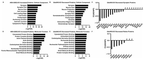 In addition to our identification of synaptic terms in our GO term analysis of GDE2-released sEVs, we identified a cluster of terms annotated under molecular function pertaining to cellular redox. Within this cluster, we identified SOD1 and the peroxiredoxin proteins PRDX1, PRDX2, PRDX4, PRDX5, and PRDX6, as either decreased or absent in the