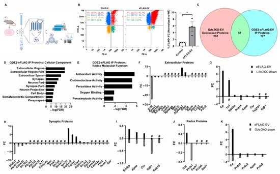 Gde2KO-EVs relative to WT-EVs, whereas PRDX2, PRDX4, and PRDX6 and the antioxidant protein CAT1 were found in GDE2-eFLAG-EVs. These proteins are critical for neuronal redox homeostasis and have been shown to be dysregulated in neurodegenerative diseases, such as AD and ALS [