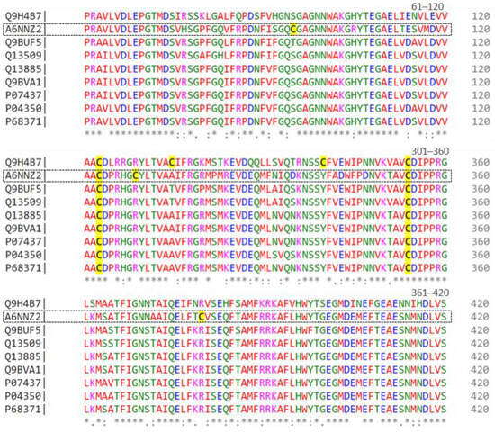 To further analyze these tubulins, Figure 1 displays an alignment of nine sequences represented by UNIPROT codes. Residues 61 to 420 of each sequence are depicted, with colors indicating their chemical properties, such as charge, polarity, or hydrophobicity. The symbols below the residues denote the degree of similarity, where ‘*’ signifies identical residues, ‘:’ indicates very similar residues, and ‘.’ denotes slightly similar residues. Numbers on the right side indicate the position of residues in each sequence, with cysteines highlighted in yellow.