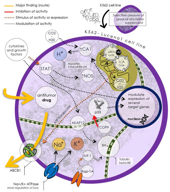The Lucena 1 cell line proposal of a distinctive phenotype implicated in drug resistance, notably expressing P-gp/ABCB1, a prominent efflux pump responsible for extruding antitumor drugs. Regulatory control over intracellular pH is mantained by TCAI, a carbonic anhydrase isoform, while Na+/K+ ATPase preserves ion gradients. Lucena 1 modulates various genes, affecting processes like the urea cycle, citric acid cycle, apoptosis, and cell signaling. These mechanisms influence Lucena 1 cell responses to antitumor drugs, ultimately affecting their resistance or sensitivity.