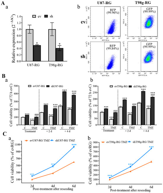 To evaluate the acquired TMZ-resistance and subsequent regrowth capacity of RG cells, an MTT assay was conducted after 72 h of TMZ treatment (treatment phase) and on day 2 and day 4 after washing-out TMZ (post-treatment phase). Similar to the observation in shGBM cells (Figure 1B), shU87-RG cells exhibited a significantly higher viability under control conditions (C) (p < 0.001) and in the TMZ treatment phase (p < 0.001), compared with the corresponding ev groups (Figure 2Ba). Moreover, shU87-RG cells showed a significantly rapid regrowth in the post-treatment phase compared with respective evU87-RG cells. Similar results were obtained in shT98g-RG cells (Figure 2Bb). Of note, the regrowth potential was much more pronounced in shRG cells (Figure 2B), compared with their parental cells (shGBM) (Figure 1B).