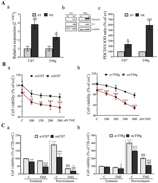 Next, we further validated the impact of PDCD10 on TMZ-induced cytotoxicity using PDCD10-overerexpressing GBM (oxGBM) cells. A 3.83-fold (p < 0.01) and 2.35-fold (p < 0.05) upregulation of PDCD10 mRNA expression was confirmed in oxU87 and oxT98g cells, respectively (Figure 3Aa). Western blot demonstrated the upregulated protein level of PDCD10 in both types of oxGBM cells (Figure 3Ab,c). MTT assay showed that cell susceptibility significantly increased in a dose-dependent manner after 72 h of TMZ treatment in both oxU87 and oxT98g cells, compared to their corresponding evGBM groups (Figure 3Ba,b). Due to the intrinsic TMZ-resistance associated with MGMT expression in T98g cells [], a lower cell susceptibility was observed in ev/oxT98g cells than in ev/oxU87 cells at an identical concentration of TMZ.