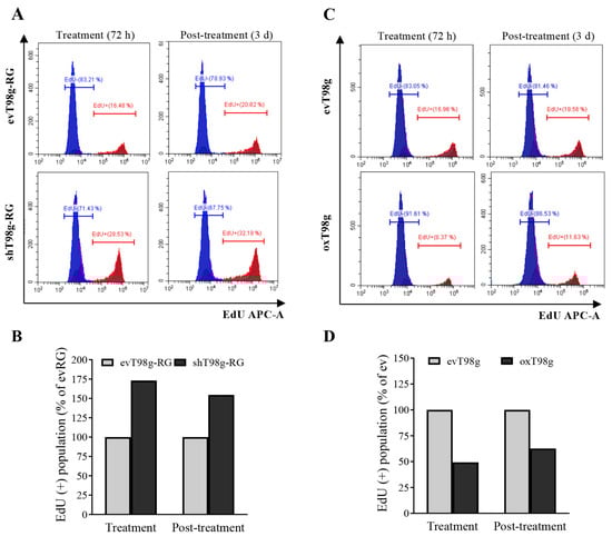 PDCD10 knockdown increased cell viability and regrowth capacity during TMZ treatment (Figure 1Ac). Moreover, we observed stronger and faster regrowth of PDCD10 knockdown cells in the TMZ post-treatment phase (Figure 2). Overexpression of PDCD10 induced inverse effects. We therefore proceeded to investigate whether DNA replication was affected in these models by utilizing a 5-ethynyl-2′-deoxyuridine (EdU) incorporation assay. EdU-positive (EdU+) cells are representative of DNA-replicating cells. Figure 4A shows an EdU incorporation histogram in ev- and shT98g-RG cells after 72 h of TMZ treatment (treatment) and after 3 d of culture in TMZ-free medium (post-treatment). Further analysis revealed a 73.1% and 56.90% increase in DNA-replicating cells in PDCD10 knockdown cells during and after treatment, compared to corresponding controls (Figure 4B). In contrast, we observed a 50.7% and 37.3% reduction of DNA-replicating cells in PDCD10 overexpressing cells, compared to controls, in the TMZ treatment phase and post-treatment phase, respectively (Figure 4C,D).