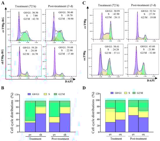 To investigate the role of PDCD10 in cell cycle progression, cell cycle status in the TMZ treatment and post-treatment phases was assessed by FACS. Knockdown of PDCD10 led to an increase in the S phase, but a decrease in the G2/M phase in response to TMZ treatment (Figure 5A,B), whereas overexpression of PDCD10 produced the opposite effects (Figure 5C,D). These findings strongly corroborate the DNA replication data presented in Figure 4, and suggest that shRG cells evade DNA replication stalling and cell cycle arrest, allowing sustained growth despite TMZ treatment. This effect could be reversed by overexpression of PDCD10. Similar results were observed in shU87-RG cells (Figure S1). As a control, a cell cycle assay was also performed with vehicle-treated ev/shT98g-RG and ev/oxT98g. The histograms are presented in Figures S2 and S3. Cell cycle raw data, including sub-G1 phase, are shown in Figure S4.