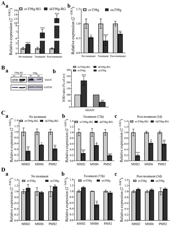 To investigate the mechanism of DNA repair and genomic instability in PDCD10 knockdown-induced TMZ-resistance, we detected the expression of MGMT and DNA mismatch repair (MMR) genes that play a pivotal role in the DNA damage response (DDR) and trigger cell cycle arrest upon TMZ treatment []. MGMT expression was notably upregulated in shT98g-RG cells, compared to in corresponding evT98g-RG cells across various conditions, including no treatment, TMZ treatment, and post-treatment phases (Figure 6Aa). In contrast, MGMT expression in oxT98g cells was downregulated across all three conditions mentioned above (Figure 6Ab). This finding was subsequently validated by western blot (Figure 6B). RT2-PCR revealed that the basal levels of MMR genes MSH2, MSH6, and PMS2 were downregulated by 0.34-, 0.55-, and 0.62-fold, respectively, in shT98g-RG cells, compared to in evT98g-RG cells (Figure 6Ca). Furthermore, shT98g-RG cells exhibited a consistent downregulation of these MMR genes in the TMZ treatment (Figure 6Cb) and post-treatment (Figure 6Cc) phases. In contrast, oxT98g cells displayed little to no change in the expression of these MMR genes, compared to evT98g cells.