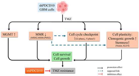 Schematic summary of the role and mechanism of PDCD10 in acquired TMZ-resistance. Knockdown of PDCD10 (shPDCD10) in GBM cells significantly increased cell survival in response to TMZ treatment, and strongly promoted tumor cell regrowth in the post-treatment phase, which collectively accounted for acquired TMZ-resistance. Mechanism studies revealed that the loss of PDCD10 modulated the expression of DNA damage response genes (i.e., upregulating MGMT and downregulating MMR genes MSH2, MSH6, and PMS2), and altered the cell cycle process, as evidenced by the evasion of tumor cells from arrest at the G2/M phase, and the increase in tumor cells in the proliferating S phase. In addition, shPDCD10-GBM cells exhibited higher cell plasticity, as demonstrated by an increased capacity for colony formation and transformation of shPDCD10-GBM cells into GSC-like cells that expressed higher levels of the stem cell markers Nestin and KLF4. In support of these findings, overexpression of PDCD10 (oxPDCD10) induced contrary changes in the molecular and cell behaviors observed in shPDCD10-GBM cells, increasing the sensitivity of oxPDCD10-GBM cells to TMZ treatment and suppressing tumor cell regrowth after TMZ treatment. Our results indicate that PDCD10 plays a pivotal role in acquired TMZ-resistance and thus represents a promising target for perturbing TMZ-resistance and tumor recurrence.