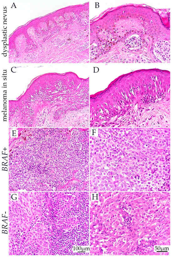 Hematoxylin and eosin staining of different melanocytic lesions included in the study. Dysplastic nevus characterised by an architectural disorder (nest bridging) and moderate cytological atypia (A,B). The confluent proliferation of melanocytes with severe atypia along the base of the epidermis with intraepidermal proliferation (pagetoid scatter), but with no apparent invasive component in melanoma in situ (C,D); Invasive components of BRAF+ and BRAF− invasive melanomas consisting of cohesive aggregates of neoplastic melanocytes (E–H).