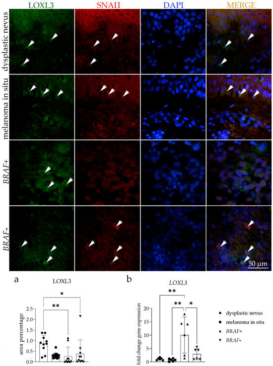 Immunoexpression of lysyl oxidase homolog 3 (LOXL3), zinc finger protein SNAI1 (SNAI1), 4′,6-diamidino-2-phenylindole (DAPI) nuclear staining image, and merged LOXL3, SNAI1, and DAPI staining in dysplastic nevus, melanoma in situ, and BRAF− and BRAF+ melanoma. The arrows show the expression pattern of LOXL3 and SNAI1 in the skin tissue. The arrows on the merged microphotographs indicate the area where co-expression was observed. Images were captured at a magnification of ×1000, with a scale bar of 50 µm applicable to all images. The LOXL3 area percentages in the tissue of dysplastic nevus, melanoma in situ, and BRAF− and BRAF+ melanoma (a). Data are presented as the mean ± SD (vertical line) and analyzed by an ordinary one-way ANOVA followed by Tukey’s multiple comparisons test. At each time point, ten representative pictures were assessed. The LOXL3 mRNA fold change gene expression comparison between dysplastic nevus, melanoma in situ, and BRAF− and BRAF+ melanoma (b). Ordinary one-way ANOVA was followed by Tukey’s multiple comparison test. Data are shown as mean ± SD (vertical line); significant differences are marked by * p < 0.05, ** p < 0.01.