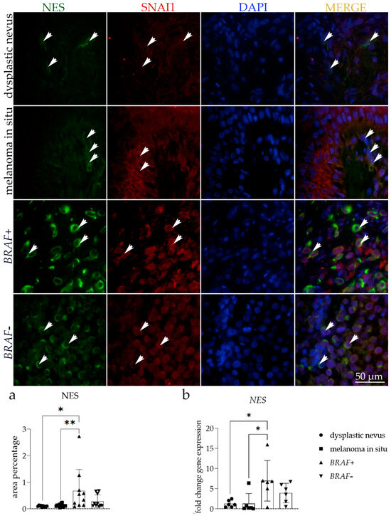 Immunoexpression of nestin (NES), zinc finger protein SNAI1 (SNAI1), 4′,6-diamidino-2-phenylindole (DAPI) nuclear staining image, and merged NES, SNAI1, and DAPI staining in dysplastic nevus, melanoma in situ, and BRAF− and BRAF+ melanoma. The arrows show the NES and SNAI1 expression patterns in the skin tissue. The arrows on the merged microphotographs indicate the area where co-expression was observed. Images were captured at a magnification of ×1000, with a scale bar of 50 µm applicable to all images. The NES area percentages in the tissue of dysplastic nevus, melanoma in situ, and BRAF− and BRAF+ melanoma (a). Data are presented as the mean ± SD (vertical line) and analyzed by an ordinary one-way ANOVA followed by Tukey’s multiple comparisons test. At each time point, ten representative pictures were assessed. The NES mRNA fold change gene expression comparison between dysplastic nevus, melanoma in situ, and BRAF− and BRAF+ melanoma (b). Ordinary one-way ANOVA was followed by Tukey’s multiple comparison test. Data are shown as mean ± SD (vertical line); significant differences are marked by * p < 0.05, ** p < 0.01.