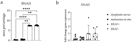 The area percentage of SNAI1-positive cells showed a significantly higher area percentage score in BRAF+ and BRAF− melanoma samples than in dysplastic nevus (p < 0.01) and melanoma in situ samples (p < 0.0001) (Figure 4a).