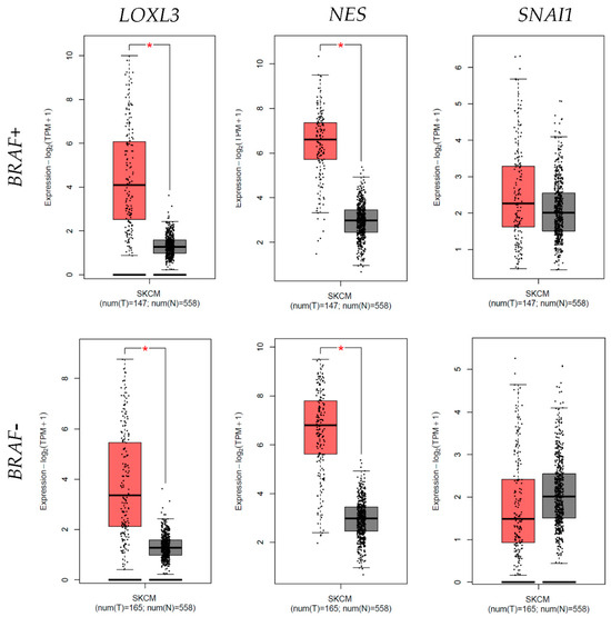 Graphic representation of the differential expression of lysyl oxidase homolog 3 (LOXL3), nestin (NES), and zinc finger protein SNAI1 (SNAI1) mRNA in BRAF+ and BRAF− melanoma (red colored bars) compared to normal skin samples (grey colored bars). Statistically significant differences were found in LOXL3 and NES mRNA differential expression in both BRAF+ and BRAF− melanoma. Data are used from the TCGA Melanoma (SKCM) study. Significant differences are marked by * p < 0.05.