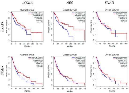 The survival rates in relation to the high and low mRNA expressions of LOXL3, NES, and SNAI1 in both BRAF-positive (BRAF+) and BRAF-negative (BRAF−) melanoma were analyzed (Figure 6).