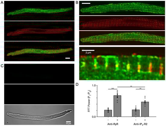 Immunocytochemistry was carried out using IP3-R2 and RyR2 antibodies and cell imaging using confocal microscopy. Figure 1 shows representative co-labelling with anti-IP3-R and RyR antibodies and also negative controls. IP3-R labelling is evident in transverse bands and at the cell periphery. Consistent with prior data [27], RyR labelling was also observed in transverse bands. The images in Figure 1A,B show partial overlap of IP3-R and RyR staining, where a magnified view in Figure 1B shows IP3-R labelling near the sarcolemma, RyRs, and nuclear envelope regions. Regularity of RyR and IP3-R labelling was quantified using Fourier analysis, for which spectral power at the first harmonic (~1.8 µm) is shown plotted in Figure 1D. For RyR2, this was 0.68 ± 0.03 (control = 0.21 ± 0.02), and for IP3-R2, this was 0.47 ± 0.03 (control = 0.22 ± 0.02). Co-localisation analysis yielded a Pearson’s correlation coefficient of 0.31 ± 0.03 (for control images 0.20 ± 0.02; p < 0.05, Wilcoxon’s rank sum). The Manders coefficient for RyR labelling overlap with IP3-R was 0.31 ± 0.03, and for IP3-R overlap with RyRs, it was 0.22 ± 0.03. In summary, rabbit AVN cells contain IP3-Rs, exhibiting a partial labelling overlap with RyRs.