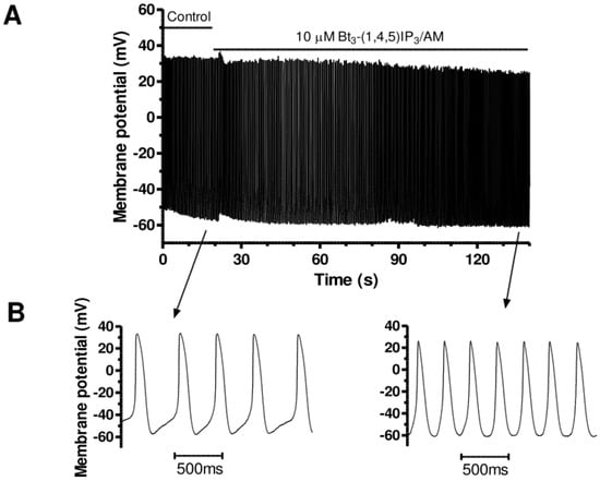 Effects of 10 µM Bt3-(1,4,5)IP3-AM on spontaneous action potentials in rabbit AVN cells.