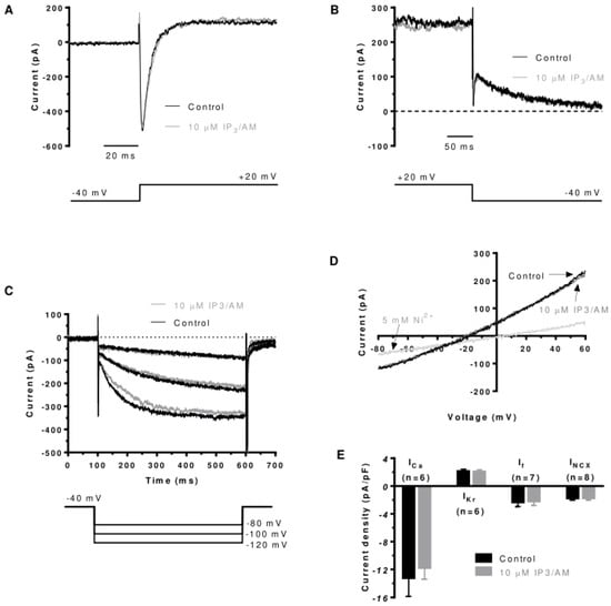 Effects of Bt3-(1,4,5)IP3-AM on ICa,L, IKr, If and INCX. (A) Representative recordings of ICa,L (upper) elicited by activating command to +20 mV (lower), in control solution, and 2 min after application of 10 μM Bt3-(1,4,5)IP3-AM. (B) Representative recordings of IKr tails (upper) following activating command to +20 mV (lower), in control solution, and 2 min after application of 10 µM Bt3-(1,4,5)IP3-AM. (C) If (time-dependent inward ‘funny’ current; upper traces) elicited by 500 ms hyperpolarizing voltage commands (lower traces) from −40 mV to −120, −100 and −80 mV. (D) Current elicited by voltage ramp from +60 to −80 mV under INCX-selective recording conditions in control solution and after 2 min of Bt3-(1,4,5)IP3-AM application. D also shows inhibition of INCX by 5 mM Ni2+. (E) Bar charts illustrating no significant direct effect of Bt3-(1,4,5)IP3-AM on ICa,L at +20 mV (n = 6), IKr tails at −40 mV (n = 6), If at −120 mV (n = 7) and INCX at −60 mV (n = 8). Pairwise comparisons for each current were made using t-tests.