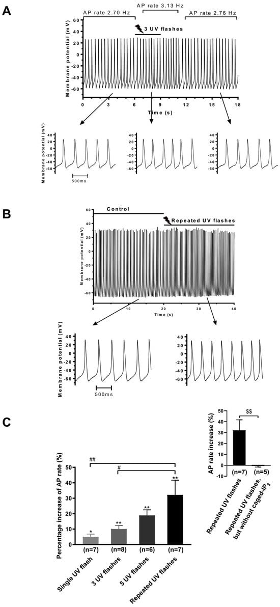 Caged-IP3 (Sichem, Bremen, Germany. Cat No. cag-6-145) was included in the pipette solution. IP3 was released from caged-IP3 by UV flash photolysis using an OptoFlash (LED 365 nm; Cairn, Faversham, Kent, UK), which was fitted onto the microscope of patch-clamping recordings. The UV flash duration was 100 ms, and intensity was 1.1 A. Single or multiple short series of flashes (up to 5) were triggered manually (about 1 s for each flash), whilst continuous repeated stimulation was automatically applied with a frequency of 1.3 Hz.