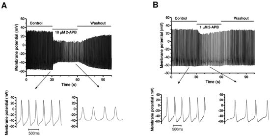 2-Aminoethoxydiphenyl borate (2-APB) exerts an inhibitory effect on constitutively active IP3-Rs [58,59,60] and has been utilised in the study of IP3-Rs in the SAN [42,43]. In order to investigate whether constitutively active IP3-Rs may influence AVN cell rate, we applied 2-APB to spontaneously active AVN cells at two concentrations (10 μM and 1 µM). Representative results are shown in Figure 7A,B. At 10 μM, application of 2-APB rapidly led to a reduction in spontaneous AP rate, accompanied by marked depolarization of the maximal diastolic potential (MDP) and reduction in AP amplitude. Mean AP parameter data from these experiments are shown in Table 4, showing statistically significant decreases in rate (by 28.0 ± 4.3%; n = 7, p < 0.01), MDP, diastolic depolarization rate, maximal upstroke and repolarization velocities, and AP overshoot and amplitude and an increase in AP duration at 50% repolarization (APD50). Application (in separate experiments) of a lower 2-APB concentration of 1 μM also led to marked reduction in AP spontaneous rate (by 25.2 ± 6.2%; n = 6, p < 0.01), with slowing of diastolic depolarization, a more modest reduction in MDP and AP upstroke velocity, and overshoot (see Table 4).