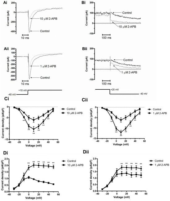 Effects of 2-APB on ICa,L and IKr. (A) Traces in Ai and Aii show representative recordings of ICa,L at +10 mV, showing inhibition at both 10 µM (Ai) and 1 µM 2-APB (Aii); protocol is shown under (Aii). (B) Traces in Bi and Bii show representative recordings of IKr tails following activating commands to +20 mV, showing inhibition at both 10 µM (Bi) and 1 µM 2-APB (Bii); protocol is shown under Bii. (C) Plots in (Ci,Cii) show current–voltage (I–V) relationships for peak ICa,L elicited by 500 ms duration depolarizing voltage clamp commands from a holding potential of −40 mV. (Ci) shows effects of 10 µM 2-APB (n = 7) and (Cii) shows effects of 1 µM 2-APB (n = 8). (D) Plots in (Di,Dii) show current–voltage (I–V) relationships for IKr tail density at −40 mV following 500 ms activating commands to the potentials plotted. (Di) shows effects of 10 µM 2-APB (n = 7) and (Dii) shows effects of 1 µM 2-APB (n = 8). ** Significant differences between control and 2-APB values (2-way ANOVA with Bonferroni post hoc test).