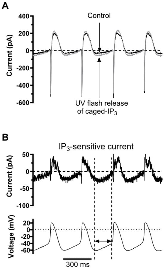 3.6. Effect of Photoreleased IP3 under AP Voltage Clamp