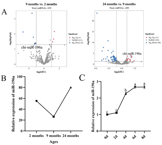 miR-196a is associated with intramuscular fat deposition. (A) Volcano plots of differentially expressed miRNAs in LM tissues of 9 months vs. 2 months and 24 months vs. 9 months. miR-196a is marked by circular ring. (B) The expression level of miR-196a in longissimus dorsi muscle at different developmental stages (2 months, 9 months, and 24 months) (n = 3). (C) Expression pattern of miR-196a during differentiation of goat preadipocytes. Different lowercase letters indicate significant differences (p < 0.05).