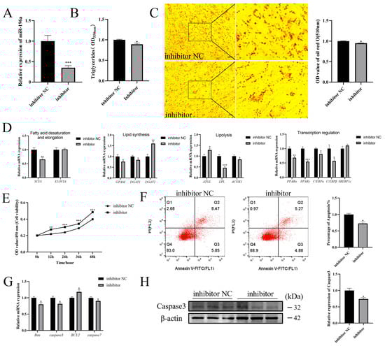 Knockdown of miR-196a inhibits adipogenesis of goat intramuscular preadipocytes and promotes their proliferation. (A) Detection of the interference efficiency after miR-196a inhibitor treatment. U6 was used as the internal reference gene. (B) Triglyceride content detection in miR-196a inhibitor and corresponding NC-treated cells. (C) Oil Red O staining and quantification of lipid droplets after interference with miR-196a (day 2 after adipogenic differentiation; 100×). (D) The relative expression of lipid metabolism-related genes after miR-196a inhibitor treatment (day 2 after adipogenic differentiation). (E) Cell viability detection after interfering with miR-196a. (F) Apoptosis detection after miR-196a inhibitor and corresponding NC treatment. (G) Relative expression of apoptosis-related genes after interfering with miR-196a. (H) Relative protein expression of caspase3 in cells after transfection with miR-196a inhibitor or inhibitor NC. The data are expressed as means ± SEM. * p < 0.05, ** p < 0.01, and *** p < 0.001.