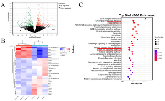 Analysis of differentially expressed genes in RNA-seq data of miR-196a-overexpressing and NC intramuscular preadipocytes. (A) Volcano map of DEGs in preadipocytes treated with miR-196a mimic and mimic NC. Red dot indicates significantly upregulated genes; green dot indicates significantly downregulated genes. (B) Heat map of the top 30 DEGs after overexpressing miR-196a in preadipocytes. Blue color–red color of band represents the expression upregulation of DEGs in miR-196a mimic and mimic NC groups. (C) The top 30 enriched pathways of DEGs after miR-196a overexpression in preadipocytes. The red boxes indicates that DEGs were involved in two lipid metabolism-related signaling pathways, focal adhesion, and the PI3K-Akt pathway.