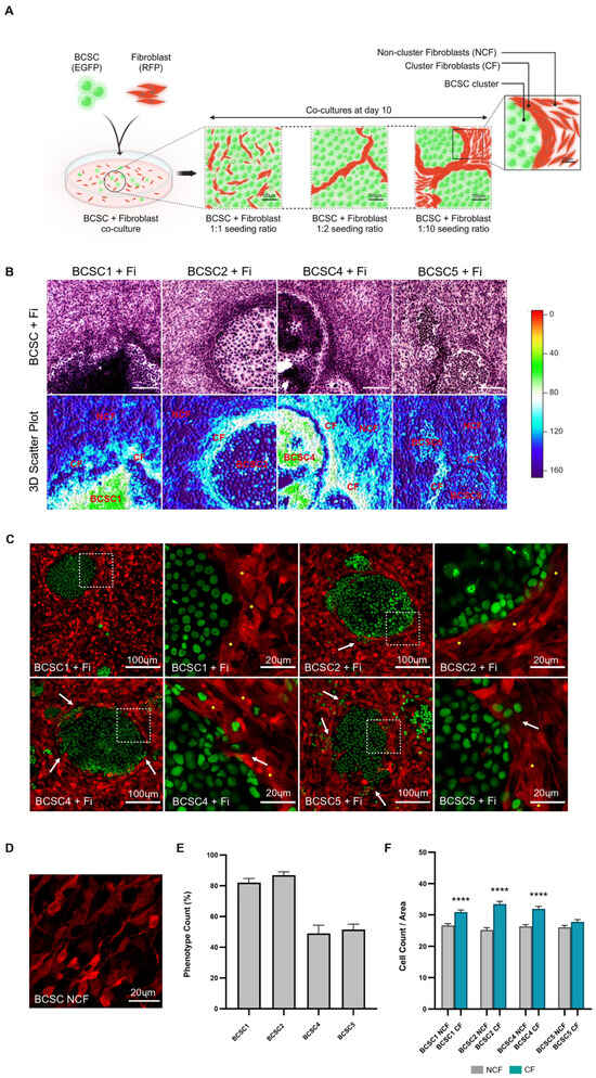 A seeding ratio of 1:10 (BCSC: fibroblast) in the BCSC + Fi co-culture model had proven the most efficient in mimicking tumor stem cell budding in surrounding stroma. The 1:10 ratio not only permitted the observation of the development of individual BCSC cells in an adequately populated fibroblastic environment but also enabled us to distinguish the SPE fibroblasts, henceforth referred to as cluster fibroblasts (CFs) in co-culture (Figure 1A,B and Figure S1A). Fibroblasts that were spatially distanced from the BCSC cluster vicinity, less aggregated, and did not participate in SPE formation around BCSC clusters were referred to as non-cluster fibroblasts (NCFs). The quantification of the nuclear count and eosin intensity in CF vs NCF in H&E-stained co-cultures confirmed the CF population to be denser when compared to the NCF population (Figure 1F and Figure S1D).