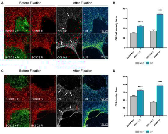 The measurement of ECM at the CF and NCF populations of the co-cultures indicated a significant increase (p ≤ 0.0001) in collagen type 1 and fibronectin at the region of the CF population of the tumor–stroma interface (Figure 2B,D). However, observation of the stromal pattern of ECM distribution revealed differences in relation to the BCSC cell line used in co-cultures. BCSC1 + Fi co-cultures displayed an overall amplification in ECM at the CF and NCF populations with a slight increase in ECM at the tumor periphery. However, the BCSC2 + Fi co-cultures displayed a highly condensed ECM deposition around the BCSC2 cluster border forming an ECM ring at the tumor periphery, in contrast to a mild ECM presence in the stromal NCF area. Areas where BCSC cluster dissemination had occurred showed a reduced ECM presence.