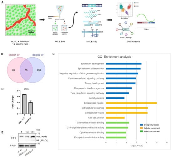 MACE-Seq analysis identifies IRF6 upregulation in BCSC CF populations. (A) Illustration depicting the sequence of procedures undertaken to analyze BCSC CF gene profile. (B) A common list of 55 genes were found to be significantly (p ≤ 0.01, FC ≥ 5) upregulated between the BCSC1 CF and the BCSC2 CF populations. (C) Gene Ontology (GO) enrichment analysis of the 55 gene list annotated in relation to biological processes, cellular localization, and molecular function. (D) Graphical representation of IRF6 mRNA expression in BCSC CF populations when compared to Co Fi (n = 2). (E) IRF6 protein expression in BCSC CF populations (n = 1).
