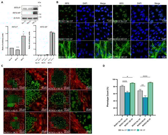 IRF6 upregulation in the BCSC1 CF and BCSC2 CF populations at the RNA and protein level was confirmed (Figure 3D,E and Figure S3E,F). Western blot analysis revealed IRF6 protein to exist as phosphorylated (P) IRF6 (band: 62 kDa) and non-phosphorylated (NP) IRF6 (band: 50–53 kDa). IRF6 immunofluorescence in BCSC + Fi co-cultures (1:10) displayed the nuclear localization of IRF6 protein (Figure S3E). However, IRF6 overexpression was not restricted to the CF population alone and was also observed in the NCF population of the BCSC + Fi co-cultures.