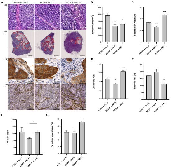 Analysis of the tumor sections revealed two main features that varied with respect to BCSC tumors grown with either KD Fi or OE Fi: the stromal fraction and the necrotic area. The BCSC1 + OE Fi tumor sections displayed several expanded regions of fibroblast streams when compared to the BCSC1 + KD Fi tumor sections (Figure 6A(I)). The quantification of the stromal vein width in different regions of the tumors revealed the BCSC1 + KD Fi tumors to have a smaller (p ≤ 0.01) width of fibroblast veins that averaged at 25 µm when compared to the BCSC1 + Scr Fi tumors, whose stromal vein width averaged at 33 µm (Figure 6C). In contrast, the BCSC1 + OE Fi tumors displayed a significantly higher (p ≤ 0.001) width of fibroblast streams that averaged at 47 µm. In addition, the fibroblast number was also quantified in the stromal streams of tumor sections (Figure 6D). The BCSC1 + KD Fi tumors had a significantly lower (p ≤ 0.05) number of fibroblasts in a given stromal area when compared to the BCSC1 + OE Fi tumors that presented a higher (p ≤ 0.001) fibroblast count. The second prominent feature, the necrotic area in BCSC1 + KD Fi tumors, appeared to be more widespread when compared to the BCSC1 + OE Fi sections (Figure 6A(II)). The measurement of the area in the necrotic zones revealed an increase in necrosis in the BCSC1 + KD Fi tumors (Figure 6E). However, the BCSC1 + OE Fi tumors showed significantly reduced necrosis with p ≤ 0.01.