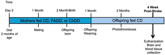 Experimental timeline of study. At 2 months of age, female mice were placed on a control (CD), folic acid (FADD), or choline-deficient (ChDD) diet. Females were maintained on diets for the duration of pregnancy and lactation until the offspring were weaned. Once female and male offspring were weaned, they were maintained on the CD. At 2 months of age, the offspring were subjected to ischemic stroke via a unilateral photothrombosis model. At 3.5 months, female and male offspring were euthanized, and blood and brain tissues were collected for analysis.