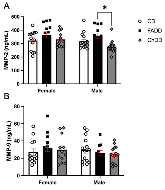 Impact of maternal diets deficient in folic acid (FADD) or choline (ChDD) and control diet (CD) during pregnancy and lactation on levels of matrix metalloproteases (MMPs)-2 (A) and 9 (B) in plasma of female and male offspring 1 month after ischemic stroke. Mean ± SEM of 10 to 14 animals per group. * p < 0.05, Tukey’s pairwise post hoc analysis between male FADD and ChDD offspring.