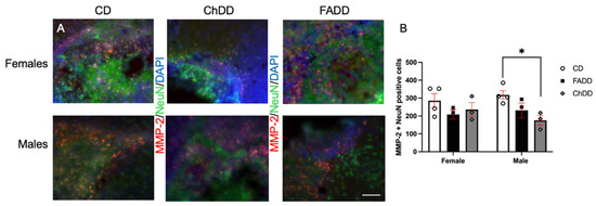 Impact of maternal diets deficient in folic acid (FADD) or choline (ChDD) and the control diet (CD) during pregnancy and lactation on neuronal levels of matrix metalloprotease (MMP)-2 in ischemic brain tissue of female and male offspring one month after ischemic stroke. Representative images of MMP-2 immunofluorescence colocalization with neuronal nuclei (NeuN) and 4′,6-diamidino-2-phenylindole (DAPI) (A) and semi-quantitative quantification of MMP-2 levels within ischemic region of brain tissue (B). Mean ± SEM of 3 to 4 animals per group. * p < 0.05, Tukey’s pairwise post hoc analysis between male CD and ChDD offspring (one-way ANOVA analysis between males and significant maternal diet main effect). Magnification 200X, scale bar 50 µm.