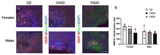 Impact of maternal diets deficient in folic acid (FADD) or choline (ChDD) and the control diet (CD) during pregnancy and lactation on neuronal levels of MMP-9 in the ischemic brain tissue of female and male offspring one month after ischemic stroke. Representative images of matrix metalloprotease (MMP)-9 immunofluorescence colocalization with neuronal nuclei (NeuN) and 4′,6-diamidino-2-phenylindole (DAPI) (A) and semi-quantitative quantification of MMP-9 levels within ischemic region of brain tissue (B). Mean ± SEM of 3 to 4 animals per group. Magnification 200×, scale bar 50 µm.