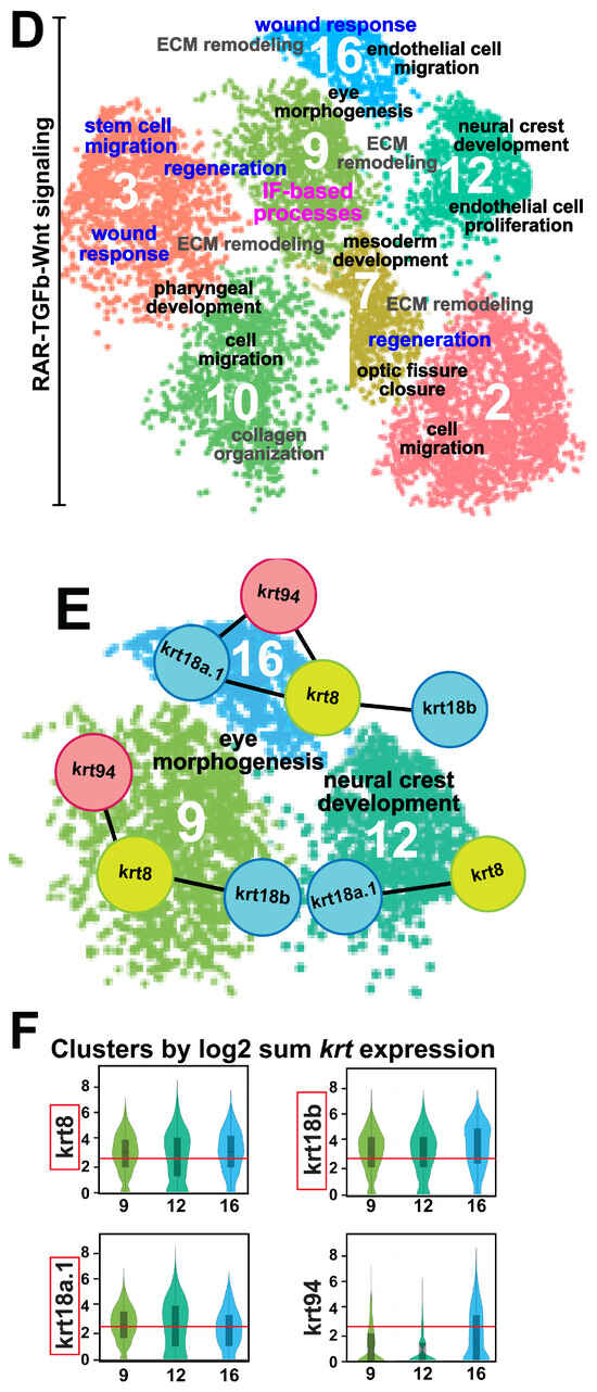Notably, as sox10 and foxd3 represent different neural crest cell subpopulations within the POM, we combined the two data sets for cluster distribution analysis to evaluate the two populations together and determine whether they remain discrete or cluster together. The results showed that both sox10 (light blue) and foxd3 (magenta) neural crest cell subpopulations primarily clustered together (purple), with few non-overlapping sox10+ and foxd3+ clusters (left panel, Figure 1B). Further analysis revealed 21 gene clusters, representing functional subgroups among these periocular/ocular neural crest cell subpopulations (right, Figure 1B). Cell type analysis was based on the upregulated expression of a collection of other POM transcription factors (pom+; left panel, Figure 1C), namely, pitx2 (paired-like homeodomain 2), foxc1 (forkhead box c1), lmx1b (LIM homeobox transcription factor 1 beta), and eya2 (EYA transcriptional coactivator and phosphatase 2), previously implicated in neural crest cell signaling during early ocular development (reviewed in [,,,,]). This analysis revealed 7 clusters of interest (COIs), showing at least 2.5-fold upregulated median expression of the other POM genes (y-axis, right panel, Figure 1C) (bolded font, x-axis, right panel, Figure 1C). Pathway enrichment analysis (Metascape) revealed gene signatures associated with events leading up to and occurring during ocular anterior segment morphogenesis, namely, ‘optic fissure closure’ (Clusters 2, 7), ‘pharyngeal development’ (Clusters 3, 10), ‘mesoderm development’ (Cluster 7), ‘neural crest development/endothelial cell proliferation’ (Cluster 12), ‘eye morphogenesis/endothelial migration’ (Cluster 16), and ‘cell migration’ (Clusters 2 and 10) (black font, Figure 1D). Signaling through RA, transforming growth factor-beta (TGFβ) and Wnt was also associated with all functional clusters, consistent with control of the positional identity of neural crest cells during eye development. Additionally, the expression of genes related to physiological processes, including ‘collagen organization’ (Cluster 10) and ‘extracellular matrix remodeling’ (Clusters 2, 3, 7, 9, 12, and 16), which are important for development, and normal organ homeostasis were also identified (gray font, Figure 1D). While associations with ‘stem cell/cell migration’, ‘regeneration’, and ‘wound response’ further supported the participation of neural crest cells in the healing and repair of ocular tissues (blue font, Figure 1D), as previously suggested []. Most notably, ‘intermediate filament-based processes’ were associated with ‘eye morphogenesis’, ‘ECM remodeling’, and ‘regeneration’ (Cluster 9) (magenta font, Figure 1D). Further analysis of functional protein associations (STRING) revealed cytokeratin intermediate filament gene networks comprising krt94, krt8, krt18a.1, and krt18b in various combinations among the clusters associated with ‘eye morphogenesis’ and ‘neural crest development’, namely, Clusters 9, 12, and 16 (Figure 1E), with krt8, krt18a.1, and krt18b showing the highest expression levels (Figure 1F).