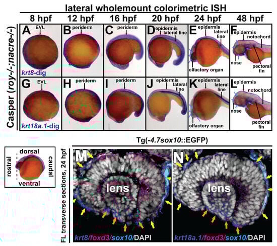 To determine roles for krt8 and krt18a.1 in the neural crest during anterior segment development, we first examined their gene expression patterns in zebrafish embryos at 8, 12, 16, 20, 24, and 48 hpf, time points corresponding to early ocular development (~1200 embryos total). Wholemount images of chromogenic (brightfield, blue) in situ hybridization showed krt8 and krt18a.1 expression on the dorsal side of the zebrafish embryo along the neural plate border and enveloping layer (EVL) at 8 hpf (Figure 2A,G) and then on the dorsoposterior side in the embryonic epithelium at 20–24 hpf, with marked krt18a.1 expression in the lateral line. Ventral ocular and craniofacial krt8 and krt18a.1 expression (Figure 2B–F,H–L) with apparent expression in the anterior segment and facial mesenchyme (blue arrows, Figure 2F,L) was detected in the developing zebrafish by 48 hpf. Section fluorescent double in situ hybridization at 24 hpf for krt8 or krt18a.1 (Cy5; dark blue) and foxd3 (Texas Red; magenta) expression, followed by immunohistochemistry for sox10-GFP (light blue), showed krt8 and krt18a.1 expression in the primordial cornea (orange arrows, Figure 2M,N) attached to the surface of the emerging spherical lens and among foxd3- and sox10-positive neural crest cell subpopulations in the periocular region (yellow arrows, Figure 2M,N). Thus, in addition to their well-characterized epithelial localization, krt8 and krt18a.1 were also expressed in the ocular and periocular neural crest during early anterior segment development in zebrafish.
