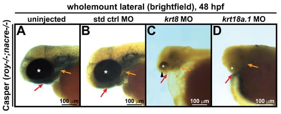 We next employed a transient knockdown approach to examine the function of these keratin intermediate filament proteins in the neural crest during early ocular development in Casper zebrafish. To knockdown K8 or K18a.1 expression, antisense MOs targeting the promoter regions of krt8 and krt18a.1 were separately injected into Casper zebrafish embryos at the single-cell stage (~600 embryos total). Examination of the phenotypic effects of K8 and K18a.1 MO knockdown at 48 hpf revealed that compared with uninjected and control-injected embryos (Figure 3A,B), MO-injected embryos exhibited coloboma (arrowhead, Figure 3C) and unusually small (asterisk, Figure 3C) or severely underdeveloped (asterisk, Figure 3D) eyes as well as acutely delayed jaw (red arrow) and pharyngeal arch (orange arrow) development (Figure 3C,D). Notably, the adverse effects on ocular and craniofacial development were more extensive with the K18a.1 knockdown than with the K8 knockdown. Nevertheless, the observed phenotypes in either case were reminiscent of the craniofacial and ocular defects observed in neurocristopathies caused by the abnormal specification, migration, or differentiation of neural crest cells [,,].