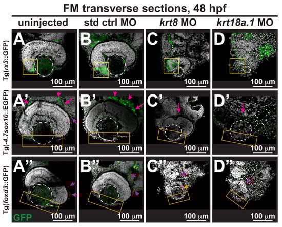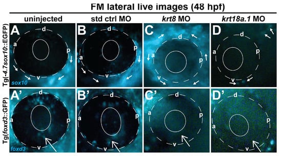 Based on these results, we further analyzed the effects of K8 and K18a.1 MO knockdown on neural crest cell dynamics in transgenic GFP reporter zebrafish lines during embryonic craniofacial and ocular development. Lateral live imaging of uninjected and standard control-injected embryos at 48 hpf revealed spatially distinct neural crest cell subpopulations, where sox10-GFP-positive cells were primarily detected in the craniofacial region (solid arrows, Figure 4A,B), with very few cells in the anterior segment (solid and dashed circles), while foxd3 GFP-positive cells were primarily observed migrating through the optic fissure (white open arrow, Figure 4A′,B′) into the anterior segment. A considerable disruption of cranial neural crest cell migration was observed in krt8 and krt18a.1 MO-injected Tg(-4.7sox10::EGFP) (Figure 4C,D) and Tg(foxd3::GFP) (Figure 4C′,D′) fish. Additionally, both sox10- and foxd3-positive subpopulations were severely dysregulated and confined to the periocular region with little to no migration into the developing eye.