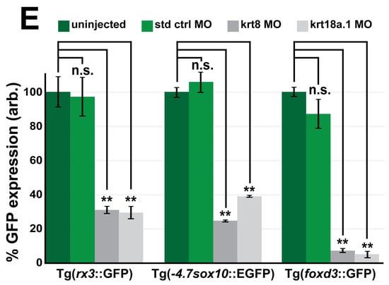 While Foxd3 and Sox10 are vital embryonic transcription factors for the specification and development of the neural crest, retinal homeobox protein 3 (Rx3), expressed in the early primordia during eye development, is essential for the determination of retinal cell fate and the regulation of stem cell proliferation. MO-mediated K8 and K18a.1 knockdown resulted in a significant loss of rx3, sox10, and foxd3 promoter-driven GFP expression (Figure 5C–C″,D–D″,E) in 48-hpf Tg(rx3::GFP), Tg(-4.7sox10::EGFP), and Tg(foxd3::GFP) zebrafish embryos compared with that in uninjected and control MO-injected fish (Figure 5A–A″,B–B″). We also observed substantial neural crest cell disorganization in the optic cup rim, which is the precursor to the neural crest cell-derived iris and ciliary body (yellow box, Figure 5C,D), and in the periocular region (magenta arrow, Figure 5C′,D′,C″,D″), and anterior segment (orange box, Figure 5C′,D′,C″,D″), in MO-injected fish. Interestingly, in all cases, the observed defects were again more profound with the K18a.1 knockdown than with the K8 knockdown. Thus, K18a.1 and, to a lesser extent, K8 played an important role in the migration and patterning of neural crest cells in the eye and craniofacial region during early development.