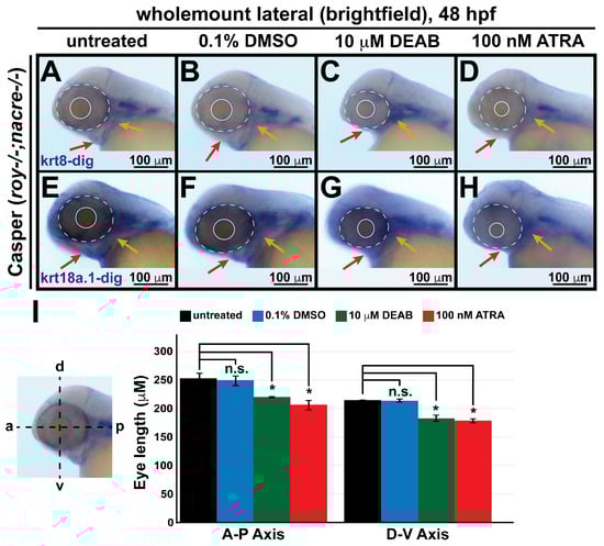 The signaling molecule RA is a major regulator of cranial neural crest cell subpopulations during embryogenesis [,,,,,]. As such, the influence of RA is dependent on coordinated, finely tuned, and highly dynamic signaling pathways that mediate the action of this morphogen in both temporal and spatial dimensions. Therefore, identifying the multiple downstream targets of RA signaling in the neural crest is paramount to understanding the contributions of these cells to anterior segment development. To examine whether changes in RA levels influence krt8/18a.1 expression in embryonic neural crest cells, we performed chromogenic (brightfield, blue) in situ hybridization analyses of 48-hpf Casper zebrafish embryos (~1200 embryos total) following exogenous treatment at 24 hpf with 10 μM N,N-diethylaminobenzaldehyde (DEAB), a selective pan-aldehyde dehydrogenase inhibitor of endogenous RA synthesis [], or at 27 hpf with 100 nM ATRA, an active vitamin A metabolite and RA receptor ligand [,,]. Phenotypic analysis confirmed that compared to untreated animals, treatment with DMSO (Figure 6A,B,E,F,I) did not significantly affect ocular and craniofacial structures. In contrast, and as expected [,,,], zebrafish subjected to both exogenous treatments showed effects consistent with congenital craniofacial and ocular anomalies, including significantly decreased eye size (dashed and solid circles, Figure 6C,D,G,H,I), as measured along the dorsoventral and anteroposterior axes, and markedly retarded jaw and pharyngeal arch formation (red and orange arrows, respectively, Figure 6C,D,G,H).