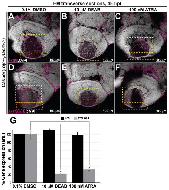 For experiments involving pharmacological treatments, all-trans retinoic acid (ATRA; R2625; Sigma-Aldrich) and the reversible aldehyde dehydrogenase inhibitor 4-diethylaminobenzaldehyde (DEAB; D86256; Sigma-Aldrich) were prepared as 1000x stock solutions in dimethyl sulfoxide (DMSO; Sigma-Aldrich). For each pharmacologic agent, the concentrations used in the final experiments (i.e., 100 nM ATRA and 10 μM DEAB) are predicated on the LD50 and phenotype consistency and are consistent with the concentrations used in previous experiments resulting in the same phenotype []. The final concentration of 0.1% DMSO was used as a vehicle control. All pharmacological treatments were conducted in dark conditions because of the light sensitivity of the reagents. For embryonic experiments, Casper embryos, at 50 to 100 embryos per treatment group, were dechorionated, and pharmacologically treated between 24 and 27 hpf (as described in Section 3. Results). The experiments were repeated 4–6 times. At 48 hpf, the phenotypes were assessed by wholemount in situ hybridization, followed by cryosectioning and imaging as described above. For experiments involving adult zebrafish, an equal number of male and female, age-matched (> 90 days postfertilization) fish were treated by immersion in a minimum of 250 mL of freshly prepared treatment solution (in system water). Experiments used 4–6 adult fish per treatment group and were repeated a minimum of 3 times. The fish were euthanized after 24 h of treatment. The eyes were harvested, fixed in 4% PFA overnight at 4 degrees Celsius, subsequently cryoprotected in successive sucrose solutions, embedded in O.C.T compound, and then sectioned in an orientation with the lens facing outward to obtain transverse sections at 10 μm. The sections were mounted with mounting media containing DAPI, coverslipped, and imaged as described above.