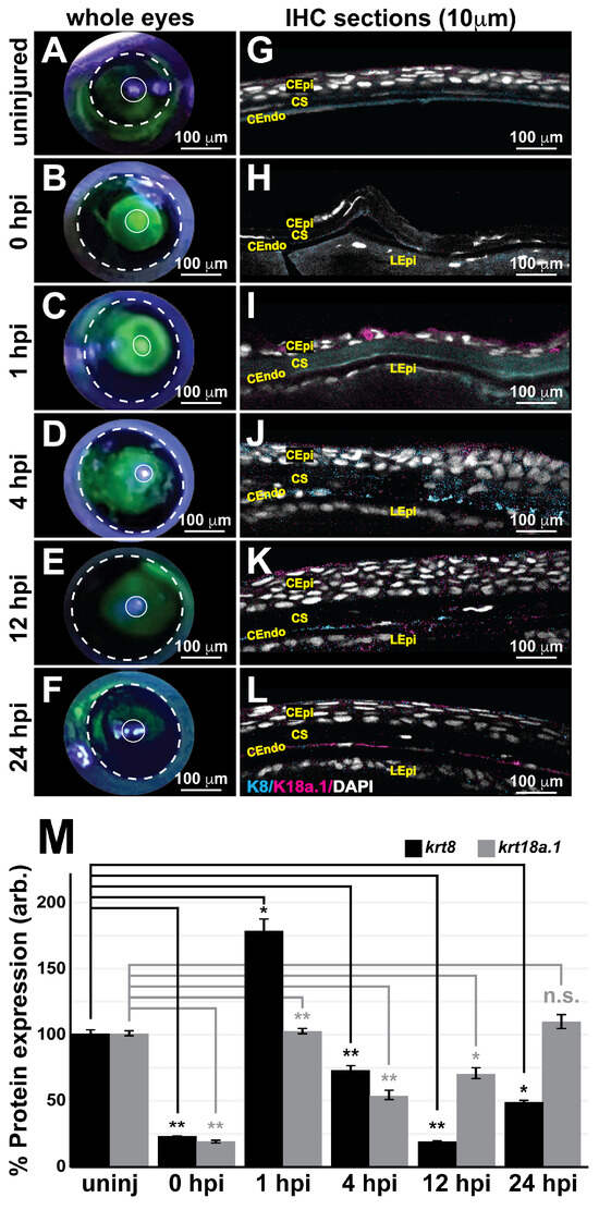Herein, a zebrafish model of corneal injury was employed to examine the idea that postnatal wound healing recapitulates embryogenesis through the activity of multipotent neural crest stem cells, and as such, the involvement of K8 and K18a.1 should be apparent during injury repair. Zebrafish are excellent models to study regeneration and injury repair processes, as their eyes are very similar to those of their human counterparts. Notwithstanding, in contrast to humans, zebrafish can avoid scarring and fibrosis and successfully regenerate damaged tissues [,,,,,,,,]. In this study, we observed the complete regeneration of the adult zebrafish eye by 24 hpi, with the re-establishment of the corneal layers within 1 h after ocular insult.