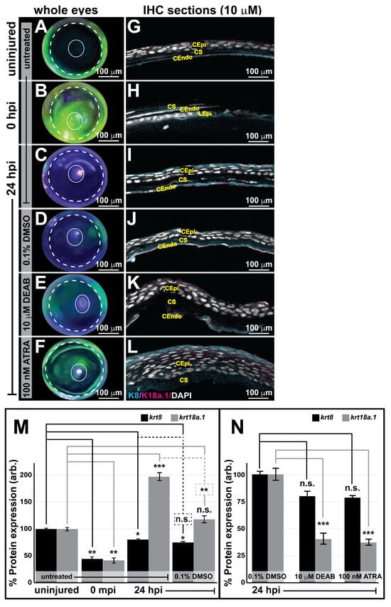 The effects of alterations in RA levels on postnatal corneal wound healing and K8/18a.1 expression at 24 hpi in adult zebrafish treated with or without 0.1% DMSO, 10 mM DEAB, or 100 nM ATRA (~104 adult fish total) were analyzed. Fluorescein dye tracing revealed a disruption in ocular wound healing at 24 hpi in response to alterations in the levels of RA (Figure 9E,F), as the eyes of the DEAB- and ATRA-treated fish at 24 hpi still showed considerable fluorescein staining consistent with corneal abrasion (Figure 9E,F) in contrast to those of the untreated control, which showed the complete exclusion of fluorescein dye at 24 hpi (Figure 9C). Thin section (10 μm) analysis further revealed a loss of endothelial architecture as well as stromal (Figure 9K) and epithelial edema (Figure 9L) in response to the inhibition of RA synthesis via treatment with DEAB and the increased expression of RA via treatment with exogenous ATRA, respectively. Importantly, the eyes of adult zebrafish treated with the 0.1% DMSO vehicle control showed incomplete fluorescein exclusion (Figure 9D) and a slight disorganization of the healed corneal endothelium at 24 hpi (Figure 9J). However, this effect did not seem to interfere with healing, as the other corneal tissues (epithelium and stroma) appeared normal and structurally intact as compared with those in the untreated control. Consistent with the phenotypic observation of the slight influence of DMSO on ocular wound healing, injured adult zebrafish recovered in water containing the vehicle control alone showed decreased K8/K18a.1 expression in the healed cornea at 24 hpi compared to that in the corneas of their untreated counterparts measured at the same postinjury timepoint (dashed lines, Figure 9M). However, compared with the uninjured fish (solid lines, Figure 9M), K8/18a.1 expression levels in the healed corneas of DMSO-treated adult zebrafish were congruent with the results of the previous experiment (Figure 8), where a significant decrease in K8 expression and a restoration of K18a.1 expression to the initial pre-injury levels was observed at 24 hpi. Therefore, to understand the full effect of treatment with DEAB and ATRA on K8 and K18a.1 expression during corneal wound healing, the protein levels detected in response to pharmacological insult were compared to those detected in response to treatment with the vehicle alone (Figure 9N). The results showed that K18a.1 expression was significantly decreased in response to alterations in RA levels, whereas K8 expression was unaffected. Thus, altogether these results further demonstrated the importance of RA signaling during corneal injury repair and validated K18a.1, but not K8, as a downstream target of RA in the neural crest.
