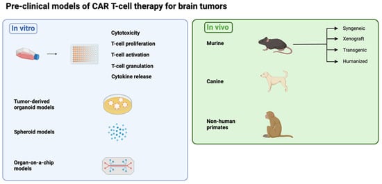 Prior to translation to clinical trials, in vivo models are essential in the evaluation of the efficacy and safety of CAR T-cell therapies for brain tumors. To date, the most commonly used models are syngeneic and xenograft murine models. Both have unique advantages and limitations, and no single approach provides a perfect pre-clinical framework. Recent advances and new models such as transgenic or humanized mice, canine models and non-human primate models provide novel ways to evaluate CAR T-cell therapies (Figure 2).