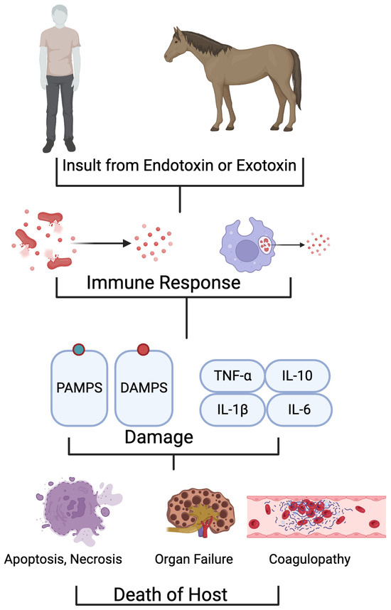 Shared pathology between humans and horses during insult from endotoxins or exotoxins during sepsis. This insult results in the production of PAMPS, DAMPS, and cytokines, leading to downstream effects such as cell death, organ failure, coagulopathies, and host death in both species.