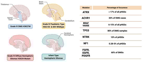 Mutations serve as a hallmark of cancer and are pivotal for comprehending the mechanisms underlying cancer development [60]. Hence, grasping the genomic mutations that trigger the dysregulation of cellular mechanisms and drive tumorigenesis constituted a fundamental principle of cancer research. The majority of pHGGs exhibit genetic complexity, which includes notable copy number alterations (CNAs), single nucleotide variants (SNVs), and structural variants [61,62,63]. Several molecular pathways, characterized by specific genetic mutations, are believed to play key roles in tumorigenesis and will be explored in the subsequent sections.