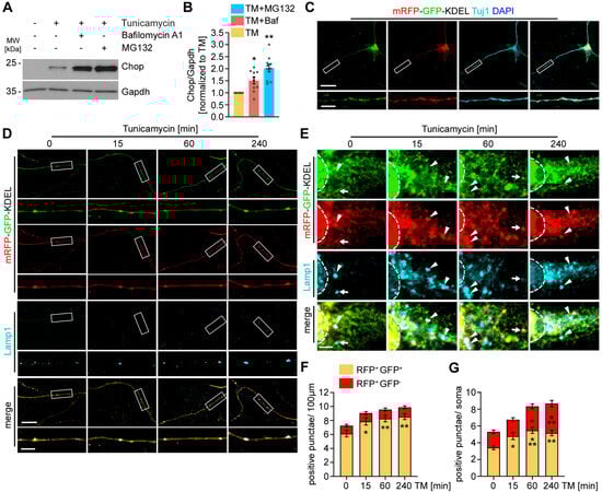 We confirmed the localization of mRFP-GFP-KDEL to axons by co-staining with Tuj1 (Figure 1C). Under basal conditions, m RFP+GFP− structures were hardly detectable in axons (Figure 1D). However, we frequently detected vesicular mRFP+GFP+ structures that stained positive for the late endosomal/lysosomal marker Lamp1 (Figure 1D), suggesting the delivery of ER fragments to autophagosomes, which underwent fusion with late endosomes during retrograde transport. These data are in agreement with earlier work, demonstrating the compartmentalization of autophagy in neurons [35,36]. Autophagosomes are predominantly generated in the distal part of axons, followed by fusion with late Lamp1+ endosomes during retrograde transport along the axons. The fusion of these vesicles with lysosomes only occurs when they have arrived in the proximal part of axons and the soma, where lysosomal degradation then occurs [35]. To explore the effect of ER stress on axonal ER-phagy, we treated primary MNs with tunicamycin for 15, 60, and 240 min and analyzed the number of mRFP+GFP− and mRFP+GFP+ punctae, which stained positive for Lamp1 (Figure 1D,E). Upon ER stress induction, we observed an increase in Lamp1+mRFP+GFP+ vesicles over time in axons, while the number of Lamp1+mRFP+GFP− remained unchanged in the axonal compartment (Figure 1F,G). In contrast, in the somata, ER stress induction triggered an increase in both Lamp1+mRFP+GFP+ and Lamp1+mRFP+GFP−- punctae, indicating that enhanced generation of Lamp1+mRFP+GFP+ vesicles in axons does not lead to any enhanced early fusion with lysosomes in axons, and that under these conditions, the fusion with lysosomes in cell bodies is enhanced.